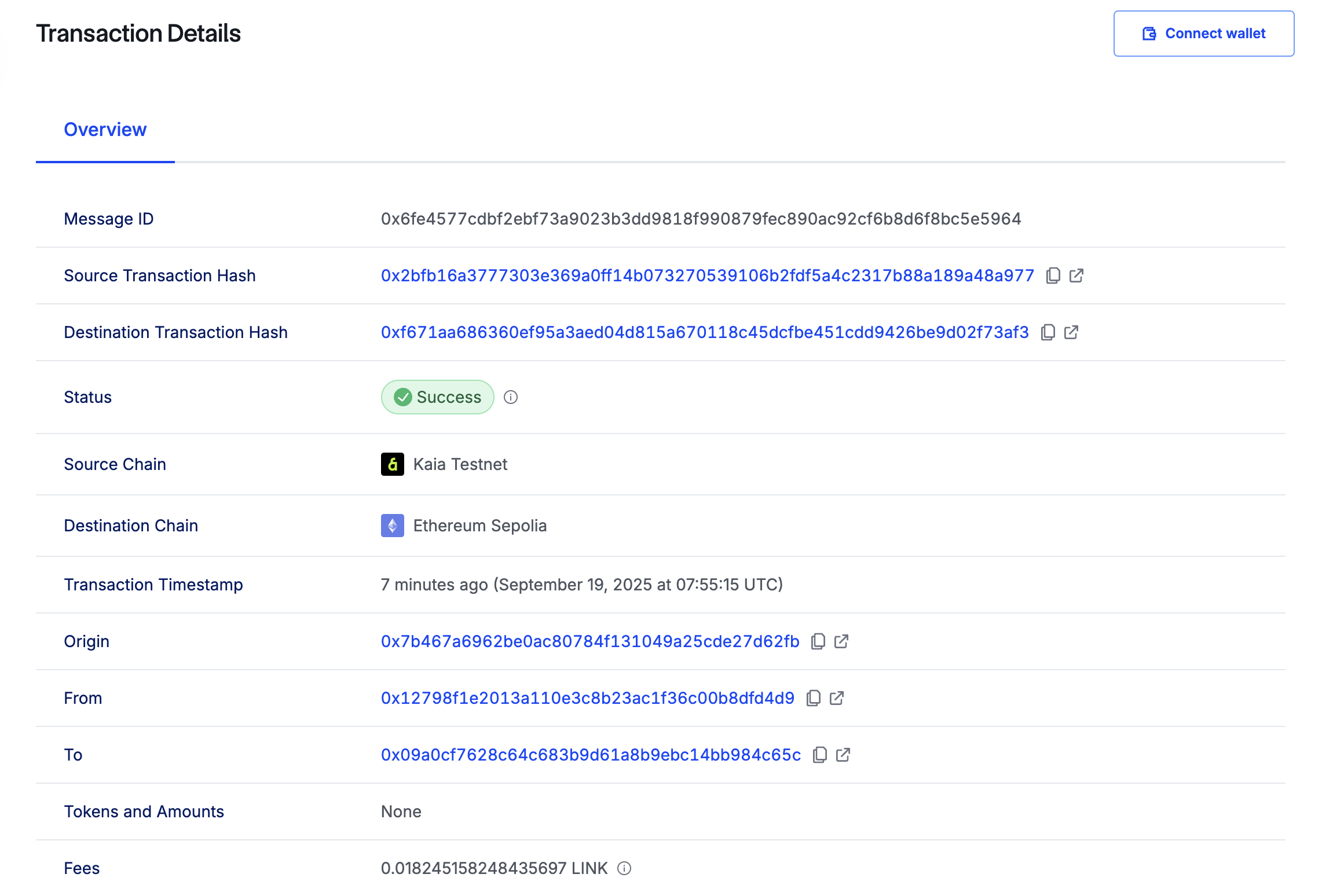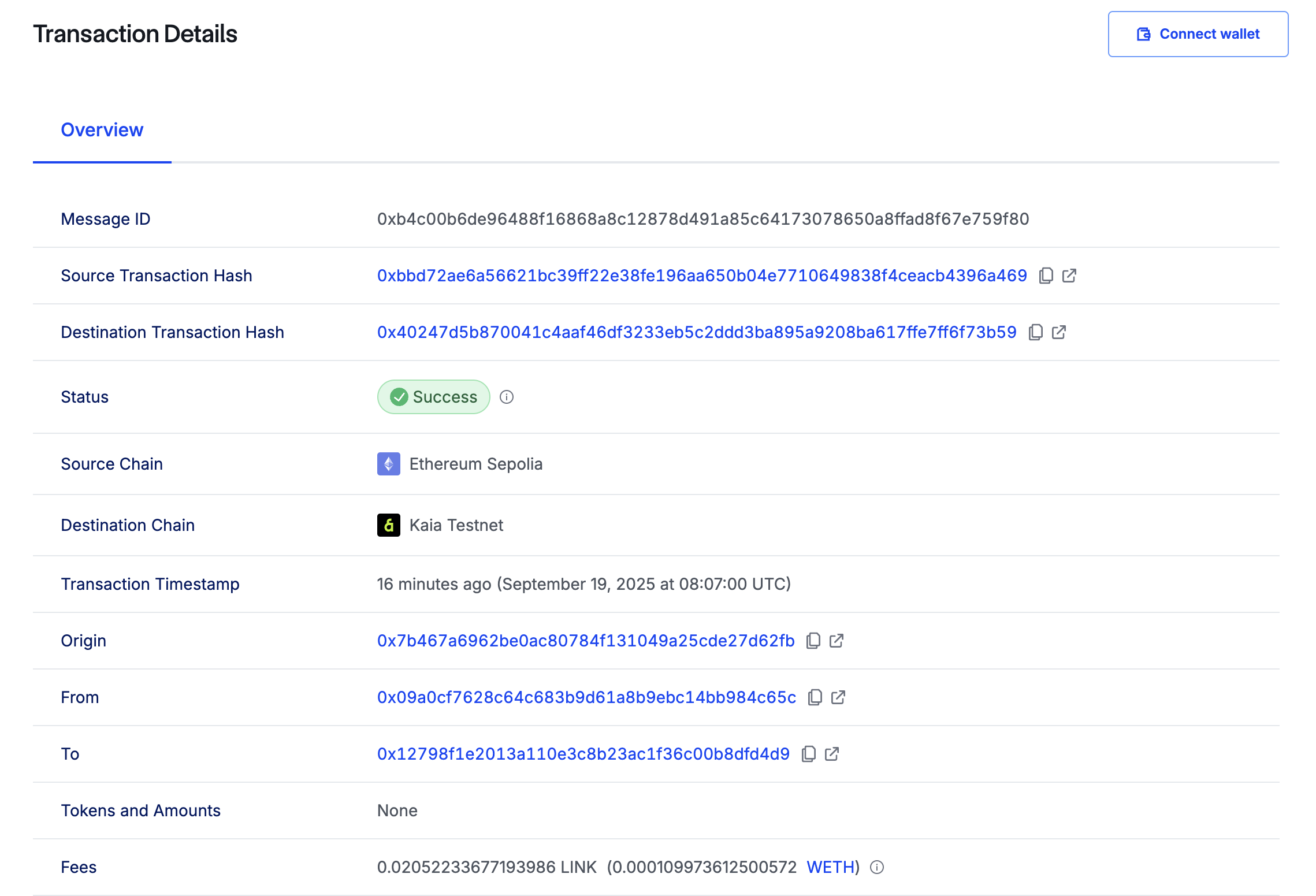 このガイドでは、Chainlink CCIPを使用してKaia(Kairos Testnet)とEthereum Sepoliaの間でクロスチェーンメッセージを送受信します。