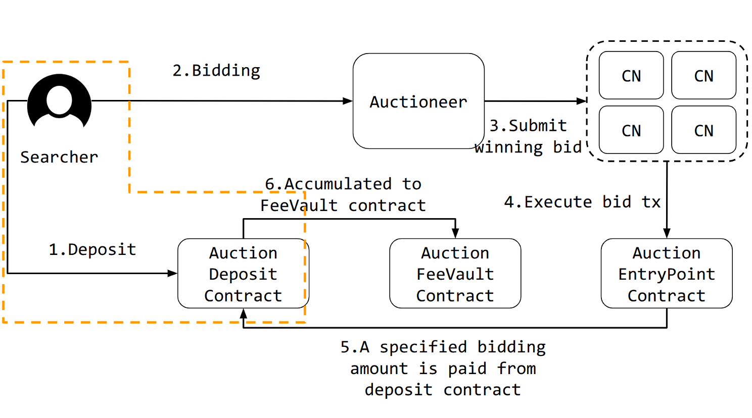 1. Deposit: Searchers deposit KAIA tokens into the AuctionDepositVault to fund bidding activity